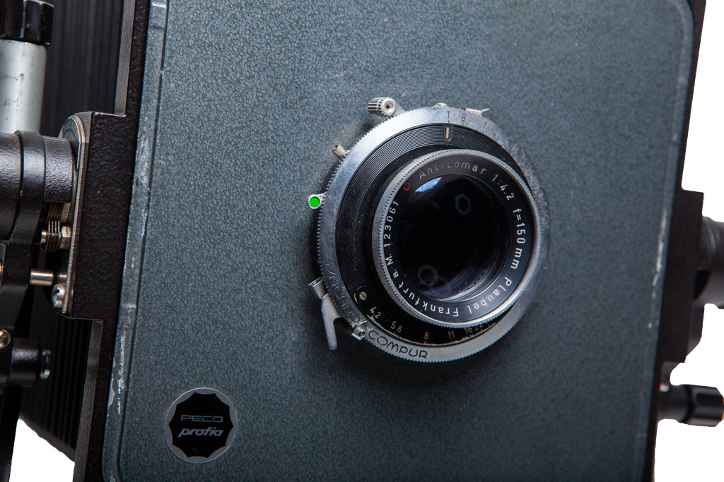 The camera is equiped with a Plaubel Anticomar 1:4,2 f=150mm and we are working on updating our lense collection.