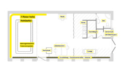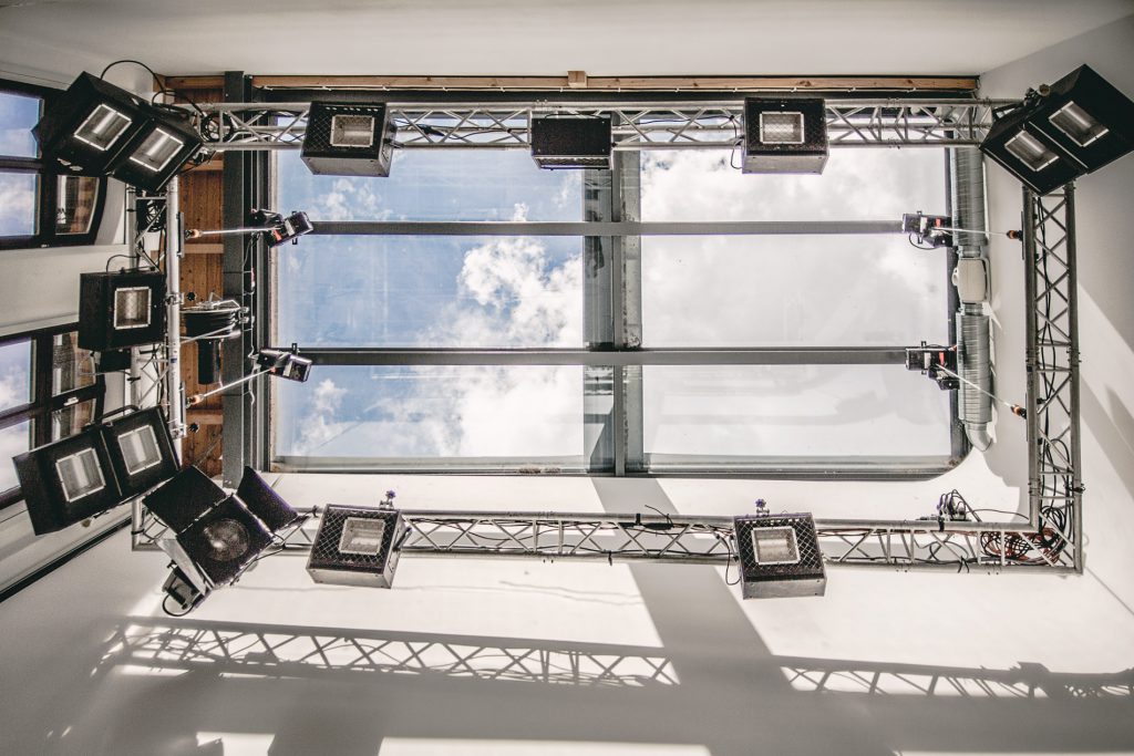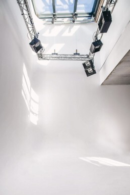 The studio is fully equipped for comfortable production, featuring an adjoining kitchenette, a bathroom with a shower and WC, and underfloor heating. The space is fitted with both high-voltage and standard power connections, accessible through floor channels with various outlets and adaptable power strips.