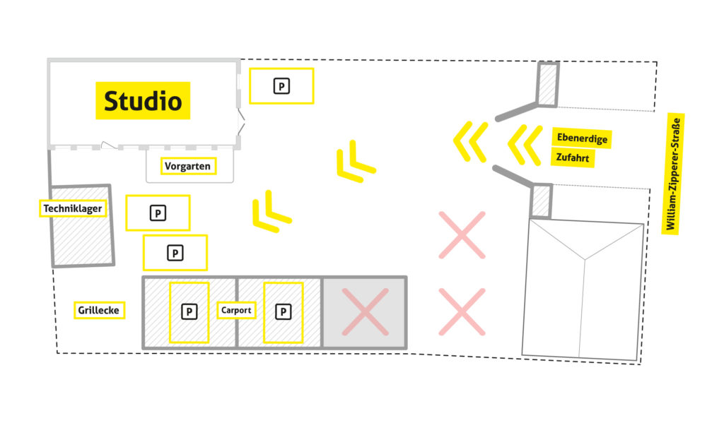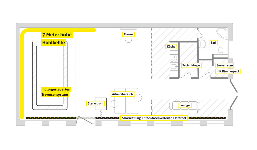 The studio’s detailed floor plans highlight the various workspaces, power connections, and outdoor areas, which include a technical storage space, parking spots, and a grilling area. The main production space measures 17 x 7 meters (LxW), including the 7 x 6 meter (WxD) cyclorama.
