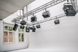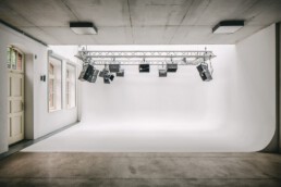 Studio Leipzig boasts a large cyclorama wall, measuring 7 x 6 x 7 meters (W/D/H), which can be lit naturally from above if desired. For those needing additional technical support, a basic equipment rental service is available on-site.